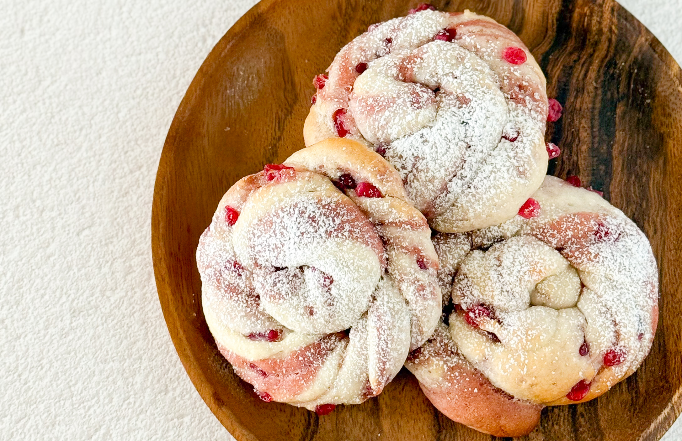 スケッパーで3箇所切り込みを入れ、生地を優しく捻ってからくるくると渦巻き上に巻く。